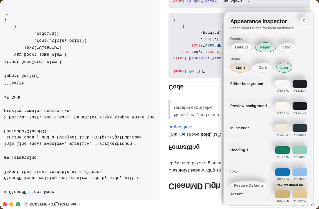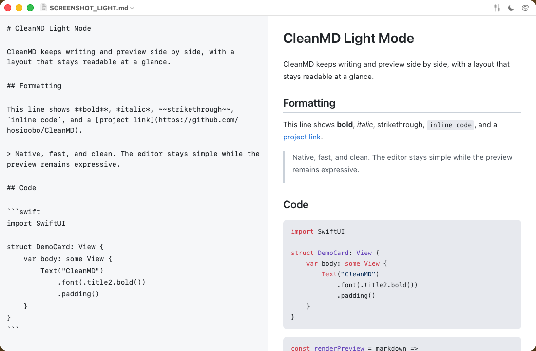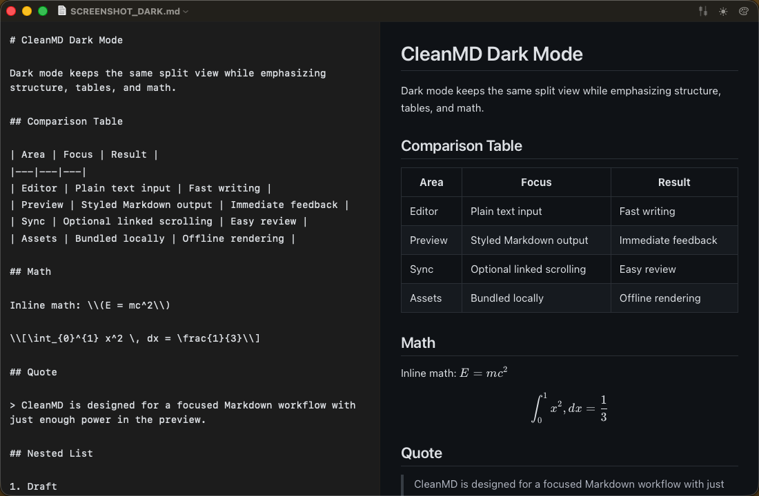 CleanMD is for people who want a native Mac workspace for local Markdown editing and rendered review.